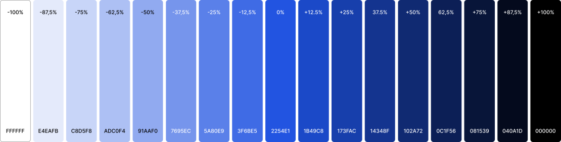 Secondary colors are shades of the primary Clockify blue. They are determined as steps toward lightness or darkness, forming a balanced spectrum around the central product color.