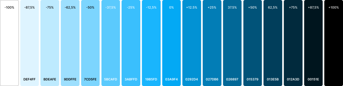 Secondary colors are shades of Clockify’s primary blue. They are determined as steps toward lightness or darkness, forming a balanced spectrum around the central product color. While primarily used for brand gradients, these tones also support visual branding through accents, backgrounds, and content hierarchy, ensuring both consistency and flexibility in design.