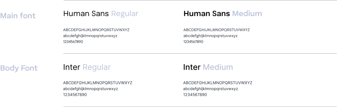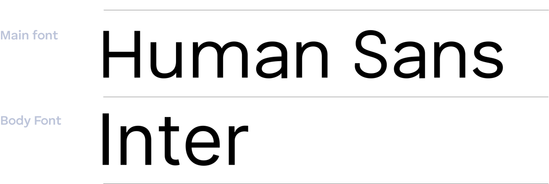 Human Sans is used for the main font, and Inter for the body font. The two modern, functional typefaces were chosen for their clarity and character that reflect our brand identity.