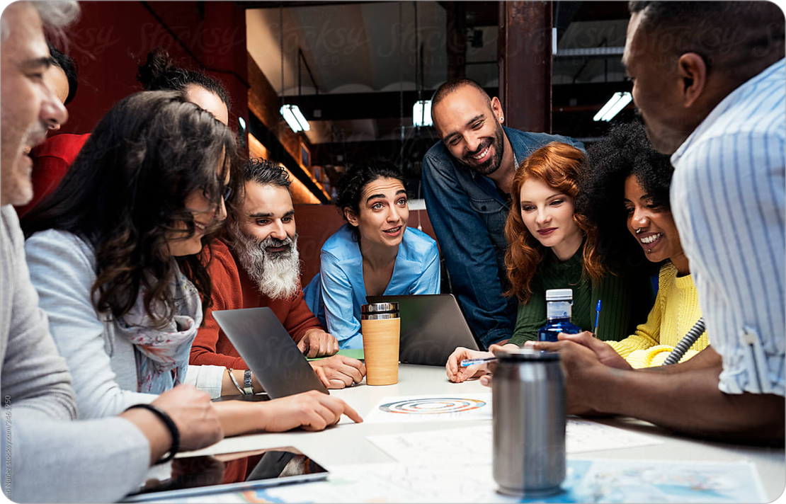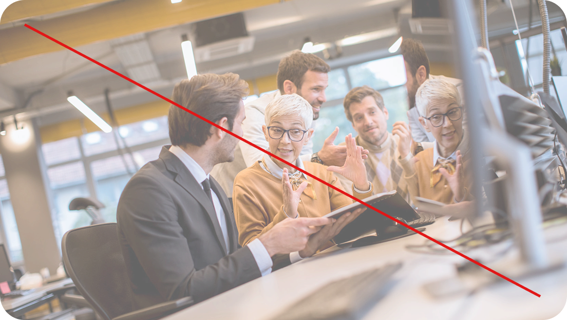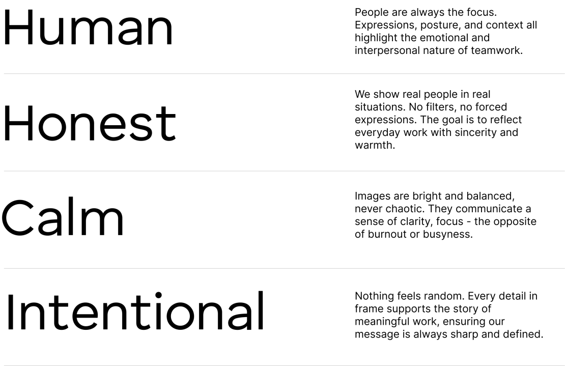 Real work environments show candid, collaborative moments in familiar, everyday workspaces. Together, they reflect our brand’s human, focused, and approachable tone.