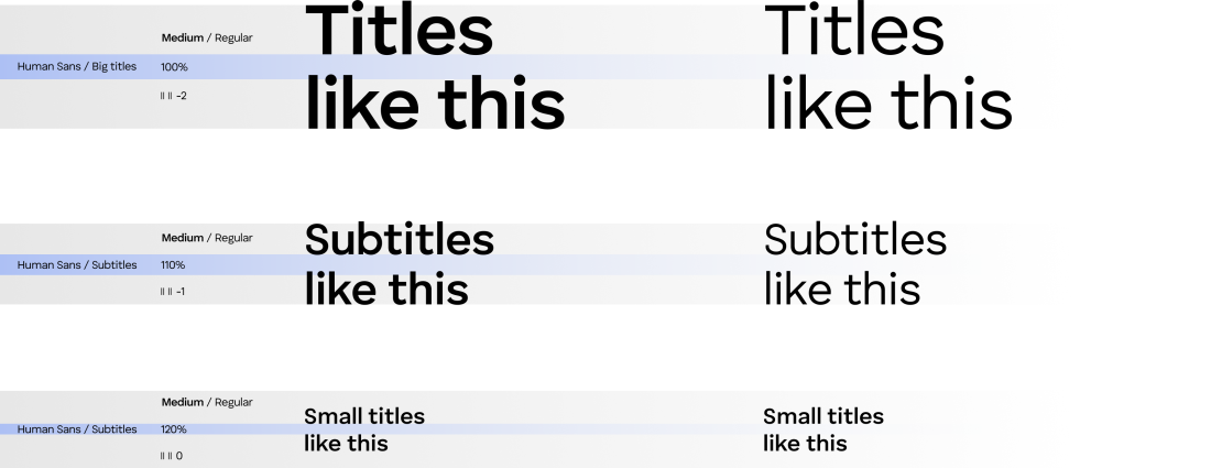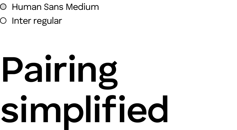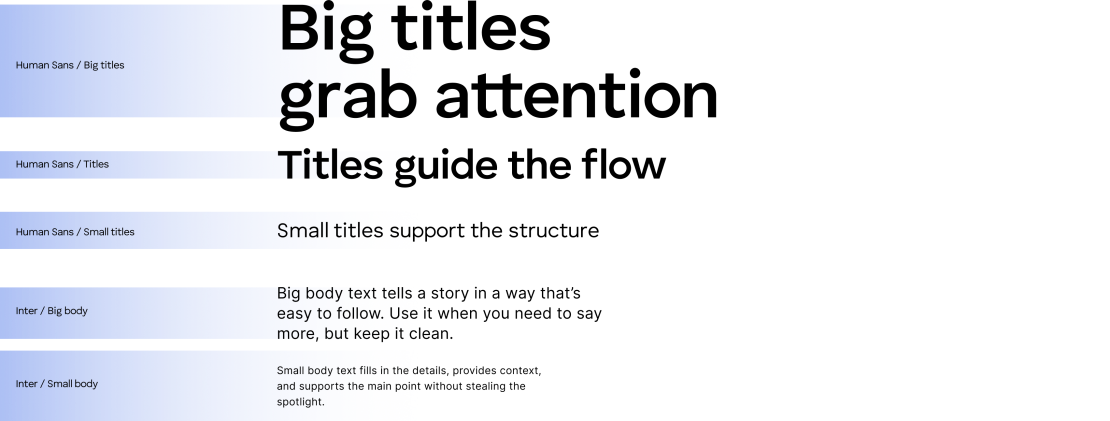 We use Human Sans for all titles because it is bold and clear, making messages stand out. Inter is used for body text because of its easy readability at any size.