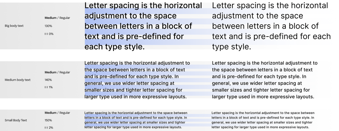 Letter spacing is the horizontal adjustment to the space between letters in a block of text and is pre-defined for each type style.